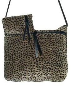 TEXTURED BLACK SPOTS ON MEDIUM TAN BACKGROUND, COORDINATED LINING, 9"W X 6"T X 1 1/2 " D, 50" PARACHUTE CORD, LEATHER ZIPPER PULL.