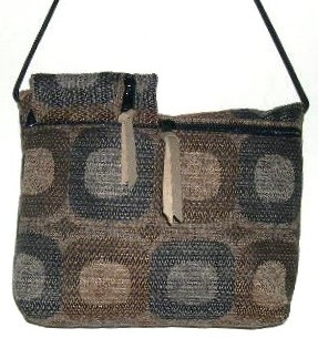 SHADES OF SOFT BROWNS AND BLUES IN GEOMETRIC CIRCLE DESIGN, COORDINATED LINING, 9"W X 6"T X 1 1/2 " D, 50" PARACHUTE CORD, LEATHER ZIPPER PULL.