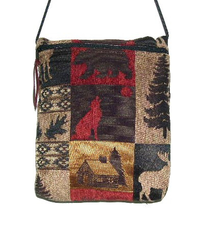A CABIN AMONG TREES AND BEARS AND MOOSE AND WOLVES IN BEAUTIFUL FALL COLORS, DIMENTIONS ARE 9" W X 9" H X 2"D, COORDINATED LINING WITH OPEN POCKET 5 1/2 X 5 1/2'", 50" PARACHUTE CORD AND LEATHER ZIPPER PULL