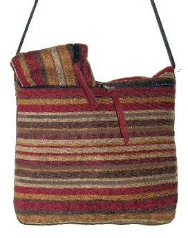 Loading... Please wait...CRANBERRY, TAN, GOLDEN BROWN AND DARK BROWN HORIZONTAL STRIPES WITH A SOFT TEXTURE, 9"W X 7"H X 2"D, COORDINATED LINING WITH AN INSIDE OPEN POCKET 5" X 5", 50" PARACHUTE CORD, LEATHER ZIPPER PULL.