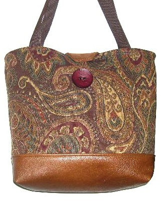 Loading... Please wait...BURGANDY AND SHADES OF BROWN PRAISLEY DESIGN, BROWN LEATHER BOTTOM, 12"H X 15"W X 5"D, TAN WATER RESISTANT NYLON LINING WITH OPEN POCKET 7"H X 6"W AND ZIPPERED POCKET 8"H X 10"W, 1"W, BROWN OVER THE SHOULDER STRAPS, FLAP WITH BUTTON CLOSER TO SECURE TOTE