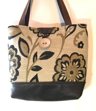Loading... Please wait...LARGE CHOCOLAYE AND MEDIUM TAN FLOWERS AND LEAVES ON LIGHT TAN BACKGROUND, CHOCOLATE BROWN LEATHER BOTTOM, 11"H X 15"W X 5"D, TAN WATER RESISTANT NYLON LINING WITH OPEN POCKET 7"H X 6"W AND ZIPPERED POCKET 8"H X 10"W, 1"W, BROWN OVER THE SHOULDER STRAPS, FLAP WITH BUTTON CLOSER TO SECURE TOTE.