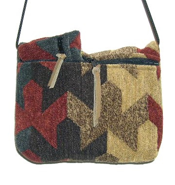 SHADES OF BROWN VELOUR IN NATIVE STYLE DESIGN, COORDINATED LINING, 9"W X 6"T X 1 1/2 " D, 50" PARACHUTE CORD, LEATHER ZIPPER PULL.