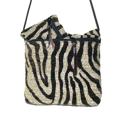 TEXTURED CHOCOLATE BROWN ZEBRA STRIPES ON MEDIUM TAN BACKGROUND, 9"W X 7"H X 2"D, COORDINATED LINING WITH AN INSIDE OPEN POCKET 5" X 5", 50" PARACHUTE CORD, LEATHER ZIPPER PULL.