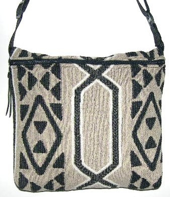Loading... Please wait...BLACK GEOMETRIC DESIGN ON MEDIUM TAN BACKGROUND, DIMENTIONS ARE 12" wide x 9" high x 2" deep. THE COORDINATED LINING HAS DEEP DOUBLE POCKETS, 1" BLACK POLYPRO WEBBING IS OVER THE SHOULDER OR ADJUSTABLE UP TO 58" FOR CROSS BODY USE. LEATHER ZIPPER PULL.