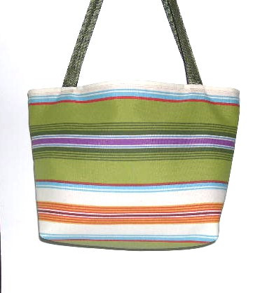 Loading... Please wait...SHADES OF GREEN COMPLIMENTED BY PURPLE, IVORY, LIGHT BLUE AND RED STRIPES , 17"W X 9 1/2"H X 5"D, LIGHT WEIGHT CANVAS, RED WATER RESISTANT LINING WITH OPEN POCKET 6"W X 7"H, OLIVE OVER THE SHOULDER WEBBING REINFORCED WITH DOUBLE STITCHING.