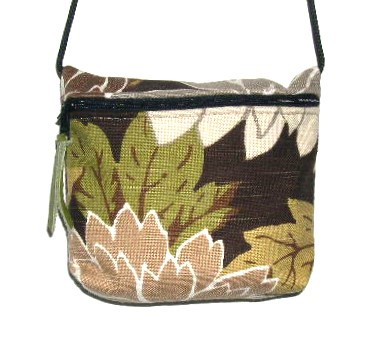 TAN, GREEN AND WHITE LEAVES ON DARK BROWN BACKGROUND, COORDINATED LINING, 6"w X 5"h X 1"d, 50" PARACHUTE CORD, LEATHER ZIPPER PULL.