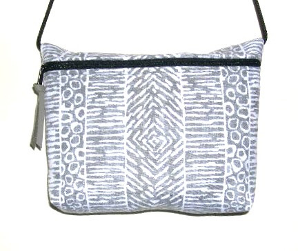 LIGHT GRAY COLUMNS OF THREE DESIGNS ON OFF WHITE BACKGROUND, COORDINATED LINING, 9"W X 6"T X 1 1/2 " D, LEATHER SIPPER PULL.
