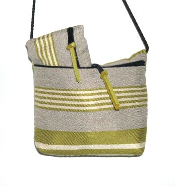 SPRING GREEN AND IVORY HORIZONTAL STRIPES ON LIGHT TAN BACKGROUND, COORDINATED LINING 8"w X 6"h X 1 1/2"d, 50" PARACHUTE CORD,HER ZIPPER PULL.