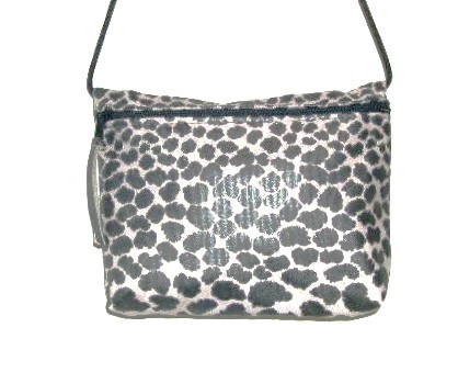 GREY LEOPARD SPOTS ON IVORY BACKGROUND, COORDINATED LINING, 9"W X 6"T X 1 1/2 " D, LEATHER ZIPPER PULL.