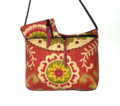 FLOWERY DESIGN OF GREEN AND BEIGE ON A MUTED RED BACKGROUND, COORDINATED LINING, 9"'W X 6"T X 1 1/2 " D, LEATHER SIPPER PULL.