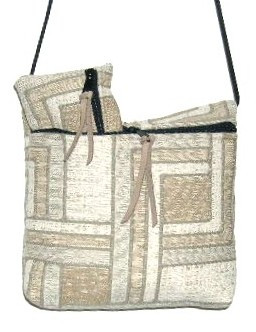 SHADES OF BEIGE IN AN INTERSECTING STRAIGHT LINE DESIGN, 9"W X 7"H X 2"D, COORDINATED LINING WITH AN INSIDE OPEN POCKET 5" X 5", 50" PARACHUTE CORD, LEATHER ZIPPER PULL.