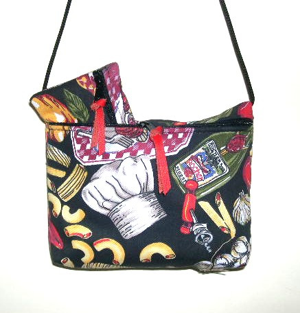 PASTA GARLIC, EGGPLANT AND WINE ON BLACK BACKGROUND, COORDINATED LINING, 9"W X 6"T X 1 1/2 " D, LEATHER SIPPER PULL