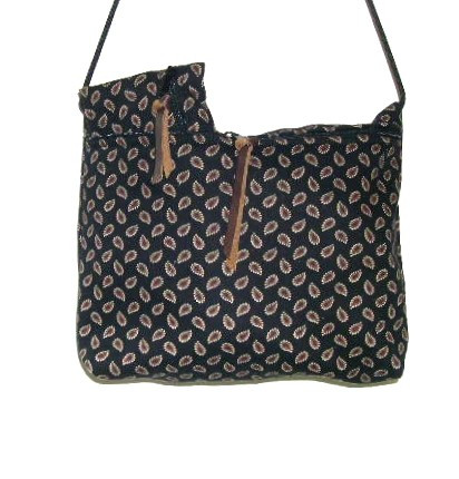 TAN AND BROWN LITTLE LEAF PATTERN ON BLACK BACKGROUND, 9"W X 7"H X 2"D, COORDINATED LINING WITH AN INSIDE OPEN POCKET 5" X 5", 50" PARACHUTE CORD, LEATHER ZIPPER PULL.