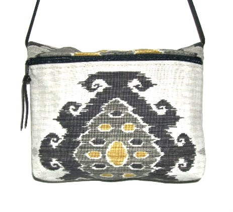 BLACK, GREY AND GREEN MAKE UP THIS SELF INTERPRETATIVE DESIGN ON IVORY BACKGROUND, COORDINATED LINING, 9"W X 6"T X 1 1/2 " D, LEATHER SIPPER PULL.