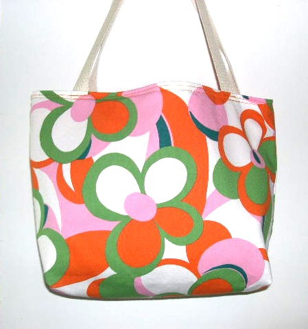 Loading... Please wait...ORANGE, GREEN AND PINK BIG FLORAL DESIGN ON WHITE BACKGROUND, 17"W X 10"H X 5"D, MEDIUM WEIGHT COTTON, ORANGE WATER RESISTANT LINING WITH OPEN POCKET 6"W X 7"H, IVORY OVER THE SHOULDER WEBBING REINFORCED WITH DOUBLE STITCHING.