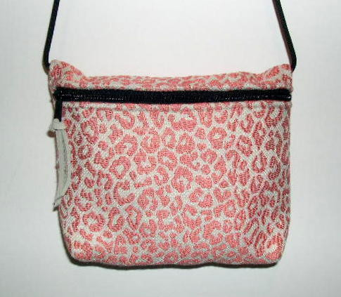 PINK LEOPARD DESIGN ON IVORY BACKGROUND, COORDINATED LINING, 6"w X 5"h X 1"d, 50" PARACHUTE CORD, LEATHER ZIPPER PULL