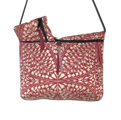 FANCY BEIGE AND RED LEAF DESIGN,10 "W X 7"H X 2"D, COORDINATED LINING WITH AN INSIDE OPEN POCKET 5" X 5", 50" PARACHUTE CORD, LEATHER ZIPPER PULL.