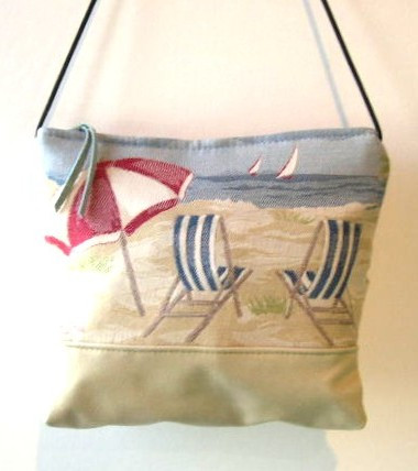 Loading... Please wait...RELAXING BEACH SCENE WATCHING THE SAILBOATS CRUISE BY, BACK SIDE SIMILAR SCENE, SAND COLORED LEATHER BOTTOM, 9"HIGH X 10"WIDE X 1" DEEP, COORDINATED LINING WITH 5"TALL X 5"WIDE POCKET, 50" PARACHUTE CORD AND LEATHER ZIPPER PULL.