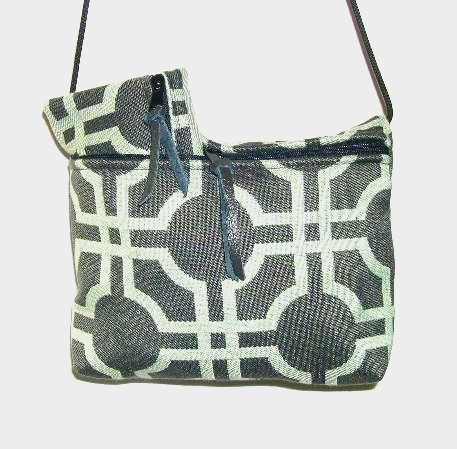 LIGHT GREY CIRCLES AND INTERSECTIONS ON CHARCOAL GREY BACKGROUND, COORDINATED LINING, 9"W X 6"T X 1 1/2 " D, LEATHER SIPPER PULL