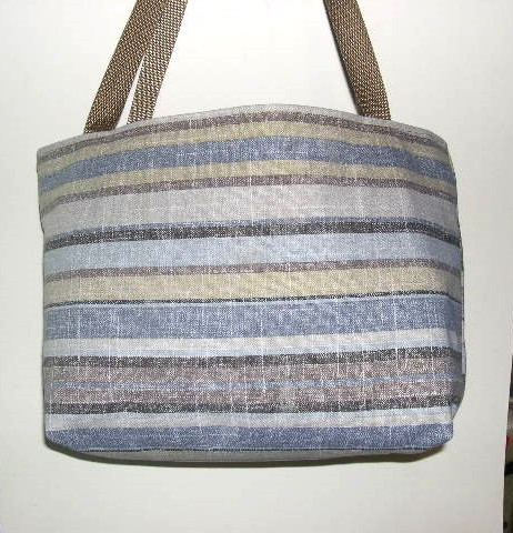 SOFT BROWN, TAN AND LIGHT GREY WAVES OF COLOR, 17"W X10"H X 5"D, LIGHT WEIGHT CANVAS, TAN WATER RESISTANT LINING WITH OPEN POCKET 6"W X 7"H, TAN OVER THE SHOULDER WEBBING REINFORCED WITH DOUBLE STITCHING.
