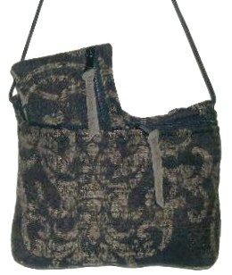 MUTED MEDIUM BROWN DESIGN ON CHOCOLATE BROWN BACKGROUND, COORDINATED LINING, 9"W X 6"T X 1 1/2 " D, 50" PARACHUTE CORD, LEATHER ZIPPER PULL.