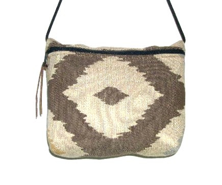 MEDIUM BROWN DIAMOND DESIGN ON LIGHT TAN BACKGROUND, COORDINATED LINING, 9"W X 6"T X 1 1/2 " D, LEATHER SIPPER PULL.