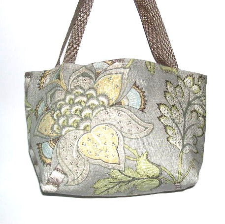 SOFTLY COLORED FLORAL DESIGN ON LIGHT TAN BACKGROUND, 17"W X 8 1/2"H X 5"D, MEDIUM WEIGHT COTTON, TAN WATER RESISTANT LINING WITH OPEN POCKET 6"W X 7"H, TAN OVER THE SHOULDER WEBBING REINFORCED WITH DOUBLE STITCHING.
