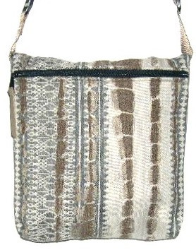 Loading... Please wait...GREY AND LIGHT BROWN VERTICAL DESIGN ON IVORY BACKGROUND, DIMENTIONS ARE 11" wide x 10" high x 2" deep. THE COORDINATED LINING HAS DEEP DOUBLE POCKETS, 1" TAN POLYPRO WEBBING IS OVER THE SHOULDER OR ADJUSTABLE UP TO 58" FOR CROSS BODY USE. LEATHER ZIPPER PULL.