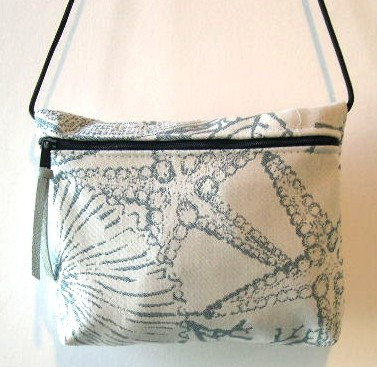 LIGHT BLUE STARFISH & SAND DOLLAR DESIGN ON IVORY BACKGROUND, COORDINATED LINING, 9" W X 6" H X 1 1/2 " D,