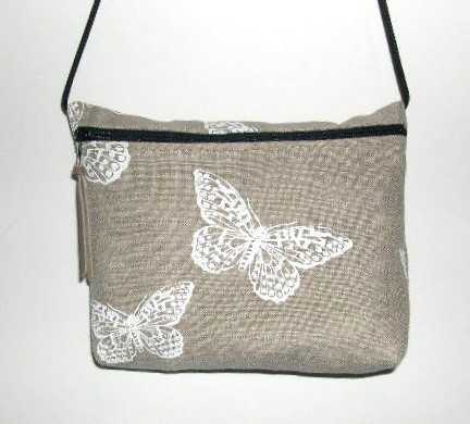 WHITE BUTTERFLIES ON LIGHT TAN BACKGROUND, COORDINATED LINING, 9"W X 6"T X 1 1/2 " D, LEATHER SIPPER PULL.