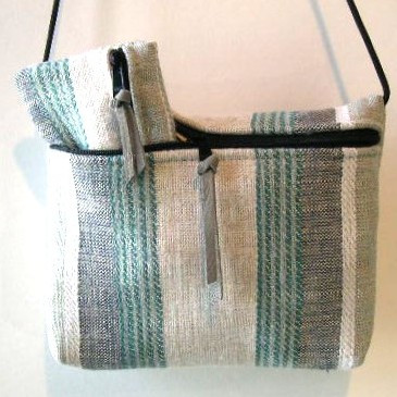 SHADES OF GREY AND MEDIUM TURQUOISE STRIPES ON IVORY BACKGROUND, COORDINATED LINING, 9"W X 6"T X
