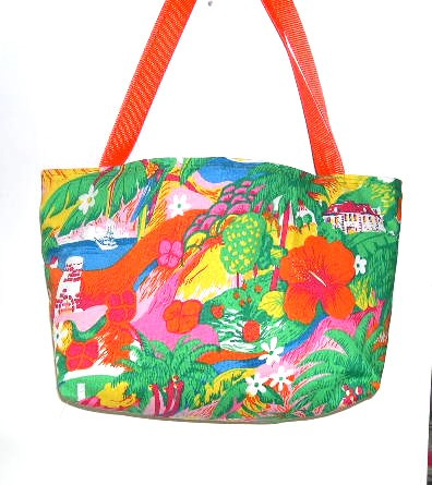Loading... Please wait...ORANGE, PINK, GREEN AND BLUE FLOWERS, TREES AND WATER IN A STRIKING DESIGN, 17"W X 9"H X 5"D, MEDIUM WEIGHT COTTON, ORANGE WATER RESISTANT LINING WITH OPEN POCKET 6"W X 7"H, ORANGE OVER THE SHOULDER WEBBING REINFORCED WITH DOUBLE STITCHING.