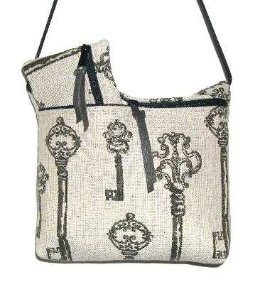 CHARCOAL COLORED KEYS OF OLD ON IVORY BACKGROUND, COORDINATED LINING, 9"W X 6"T X 1 1/2 " D, LEATHER SIPPER PULL