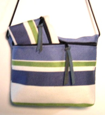 SPRING GREEN AND 2 TONES OF BLUE ON IVORY BACKGROUND, COORDINATED LINING, 9"W X 6"T X 1 1/2 " D, 50"PARACHUTE CORD, LEATHER ZIPPER PULL.