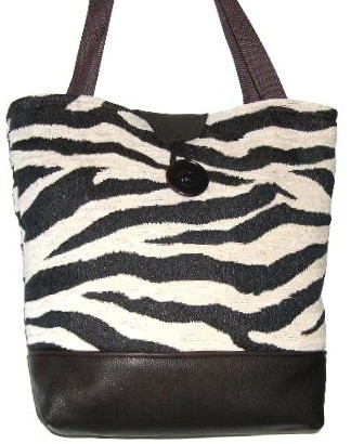 Loading... Please wait...DARK CHOCOLATE BROWN ZEBRA STRIPES ON TEXTURED IVORY BACKGROUND, DARK CHOCOLATE BROWN LEATHER BOTTOM, 13"H X 15"W X 5"D, BLACK WATER RESISTANT NYLON LINING WITH OPEN POCKET 7"H X 6"W AND ZIPPERED POCKET 8"H X 10"W, 1"W, DARK BROWN OVER THE SHOULDER STRAPS, FLAP WITH BUTTON CLOSER TO SECURE TOTE.